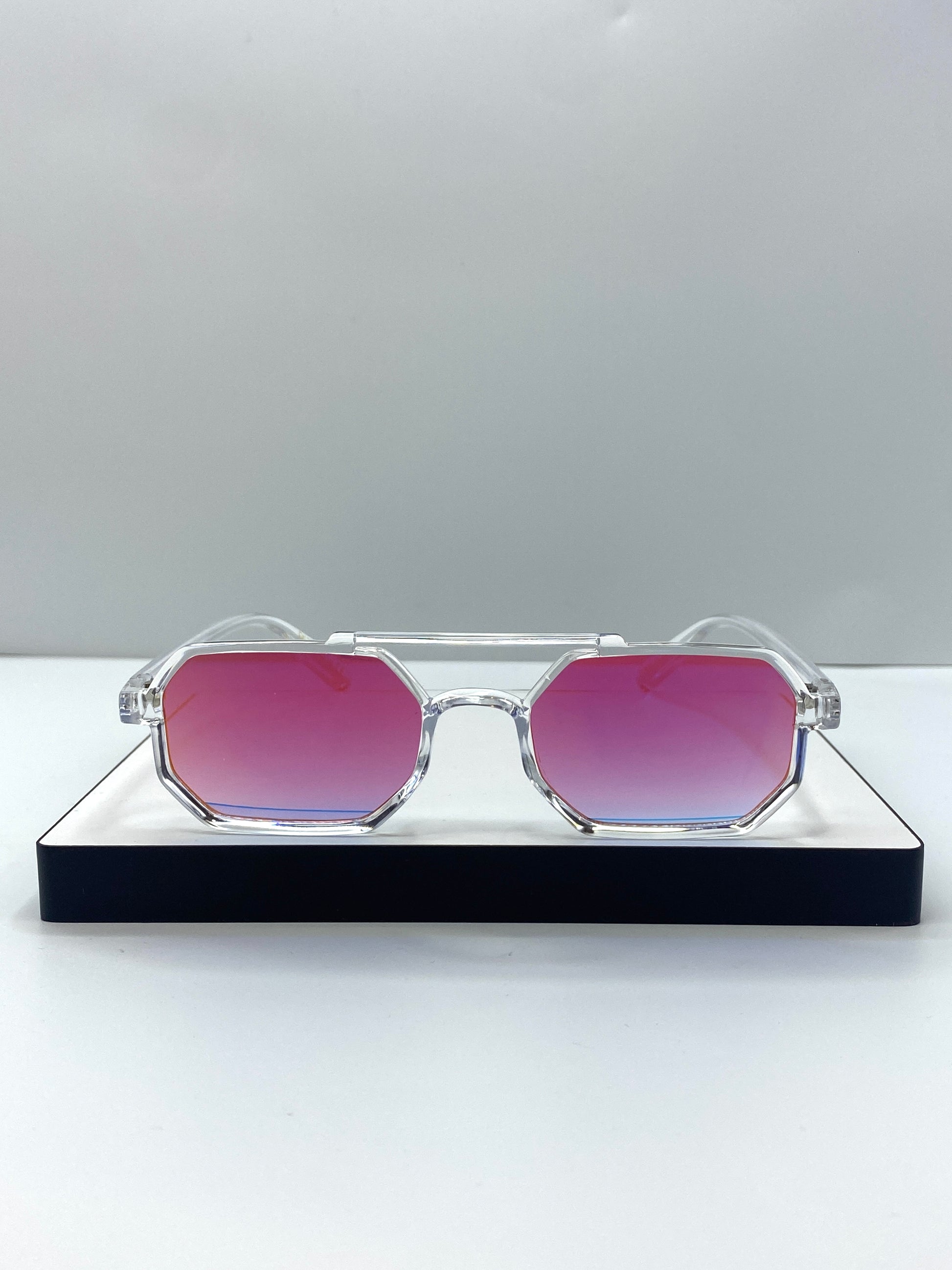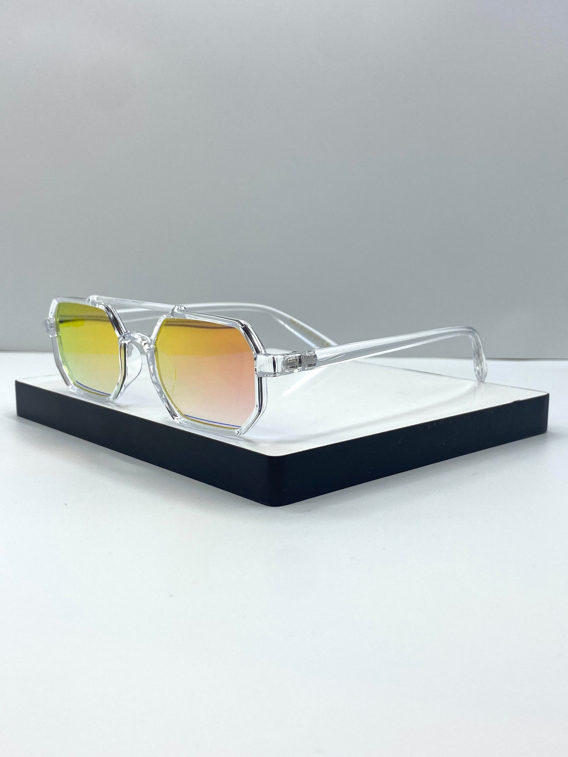 Lunettes de soleil au design géométrique moderne avec une monture transparente élégante et des verres dégradés aux nuances jaune et orangé. À la fois stylées et confortables, elles offrent une protection efficace contre les rayons UV, tout en apportant une touche lumineuse et contemporaine à votre look. Parfaites pour un style estival chic et tendance. 👓☀️